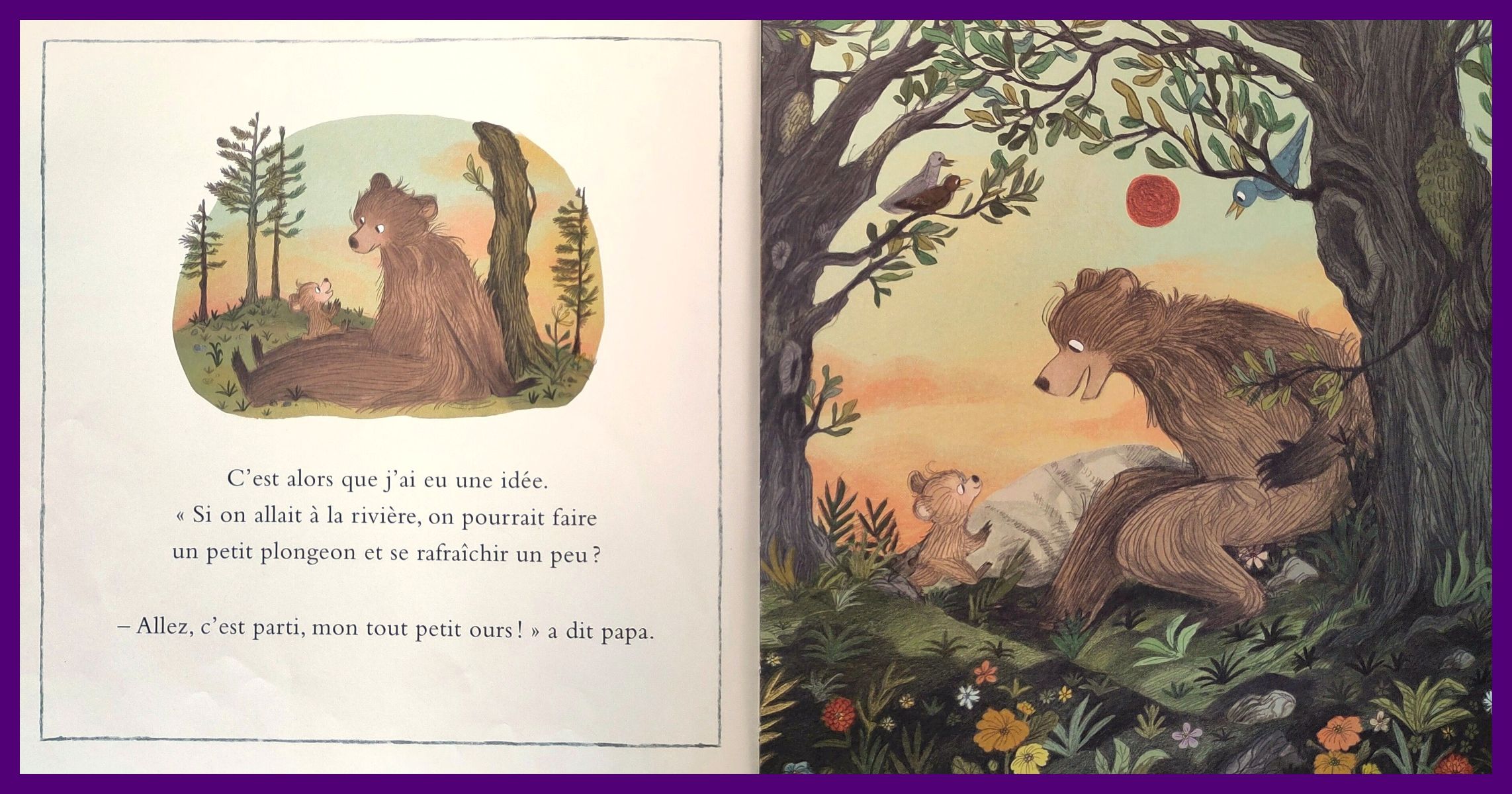 J’apprécie également particulièrement le fait que la maman soit totalement absente. Cela permet de sortir du schéma « c’est toujours la maman qui s’occupe de l’enfant », mais elle ne reste pas non plus toute la journée à la grotte pour préparer le repas pendant que Papa Ours et Petit Ours vont se baigner à la rivière. On peut très bien imaginer qu’elle fait un travail qui lui plait ou prend du temps pour elle de son côté. Il peut également s’agir d’une famille monoparentale avec uniquement un papa, qui s’en sort très bien.