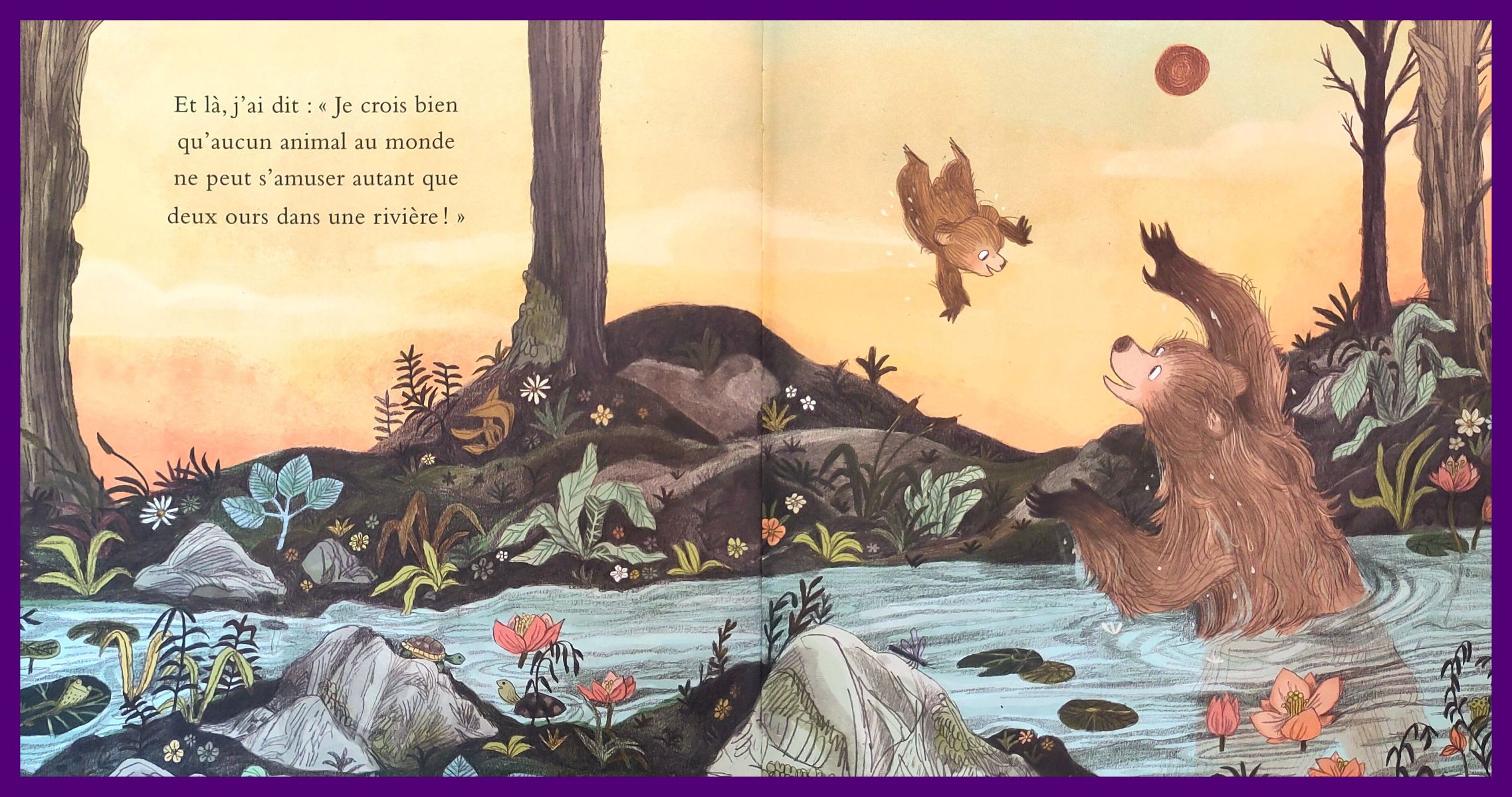 Si tu aimes les paysages naturels, tu seras servi ! « Mon tout petit ours » est un petit bijou : les illustrations de montagne, forêt, rivière et animaux sont magnifiques – très colorées mais douces à la fois, avec beaucoup de détails qu’on ne se lasse pas d’admirer.